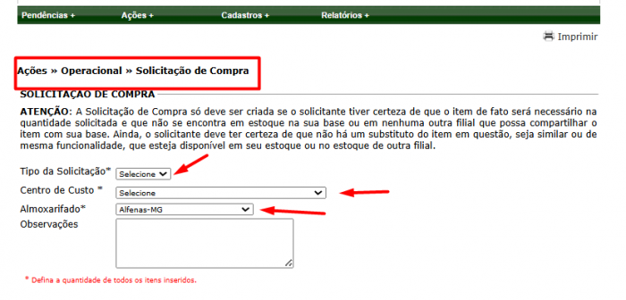 1- A operação da filial (supervisão, coordenação, gerência ou administração) solicita a compra através da tela: Ações » Operacional » Solicitação de Compra