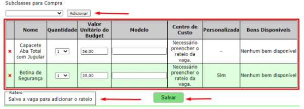 19. Subclasse para compra - Na tabela podemos identificar os equipamentos padrões dos funcionários, caso o funcionário precise de algum equipamento extra é possível adicionar através da campo abaixo do título e clicando no botão “Adicionar”