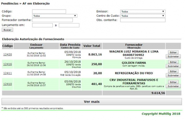 Devido à criação da alçada para classificação, para que o usuário possa salvar documentos de demanda mesmo sem possuir alçada o suficiente, foi gerada uma nova etapa para todos os documentos de demanda (AF, AS e OC). Após o usuário gerar o documento de demanda, o mesmo entrará na etapa de elaboração e deverá ser submetido para assinatura. Para submeter um documento de demanda para assinatura, uma nova tela foi gerada para cada documento (“AF em Elaboração”, “AS em Elaboração” e “OC em Elaboração”). Nessas telas, basta filtrar pelo documento de demanda desejado e clicar no botão “Submeter” para que o documento entre na etapa em que deve ser assinado.