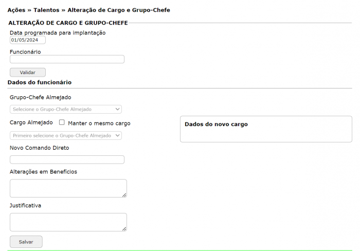Nesta tela, é possível realizar alterações no cargo e/ou grupo-chefe de um colaborador específico.