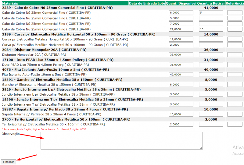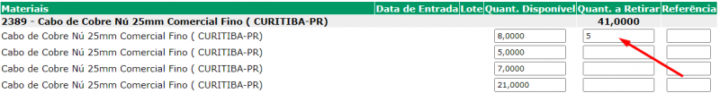 Quantidade a Retirar - Utilize este campo para informar a quantidade de material que será retirada.