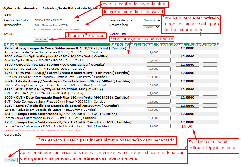Autorização de Retirada de Material (ARM): É o documento que permite ao responsável (colaborador encarregado) indicado na ARM subtrair de estoque materiais para aplicação em obra.