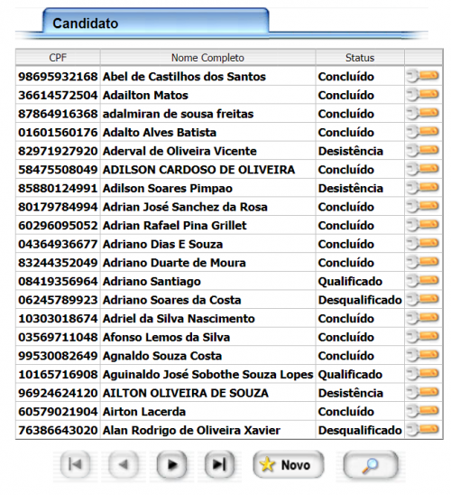Nesta tela você consegue visualizar, editar e pesquisar candidatos cadastrados no financo. Os marcados como concluído foram aprovados e são ou estão em processo para serem colaboradores.