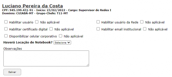d. Habilitar Usuário da Rede - Selecione este campo caso seja necessário a criação de um usuário de rede para o colaborador.
