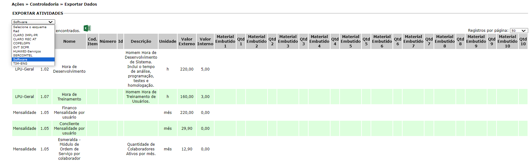Para realizar a exportação, basta selecionar o esquema desejado, e o sistema irá gerar a lista das atividades cadastradas para esse esquema. Essa funcionalidade é útil para transferir as informações de atividades para outros sistemas ou para fins de relatórios e análises.