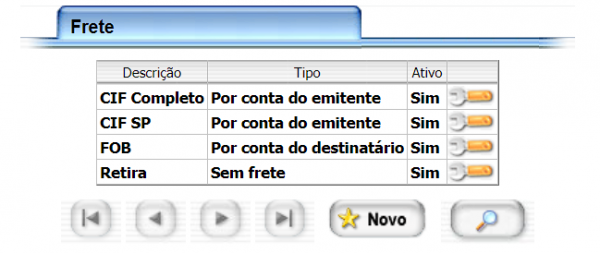 Nesta tela é possível visualizar, cadastrar, editar e pesquisar os diferentes tipos de frete utilizados nos processos de compra ou venda.