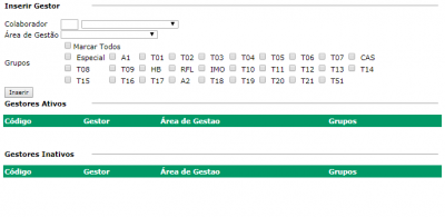 No print acima, deve ser cadastrado os responsáveis pelo tramite do Nada Consta de cada área. - Selecione o colaborador, a área de atuação que este responde e o grupo ou os grupos que este é responsável. Após clique em inserir. Após inserido o responsável é possível fazer alterações de grupo ou inativar este usuário para que não seja tramitado aos seus cuidados mais Nada Consta. Veja o exemplo de que cada colaborador poderá ser moderado em grupos