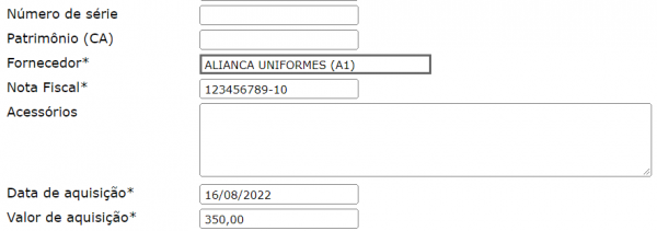 Patrimônio (CA) - A informação CA significa Certificado de Aprovação e é utilizado para os bens como EPI e EPC, nos demais casos este campo pode ser usado para o código do Patrimônio.