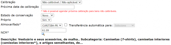 Calibração - Caso o bem estar calibrado, se necessita de calibragem ou se não se aplica a este item. Próxima Data de Calibração - Preencha com a próxima data de calibragem.