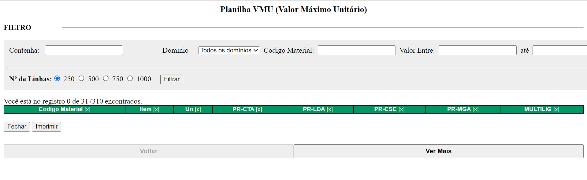 Essa tela serve para exibir o VMU (Valor Máximo Unitário) de cada material do sistema para cada almoxarifado. O VMU é uma trava que impede de algum usuário realizar a compra de um material para algum almoxarifado com valor unitário maior do que o VMU.