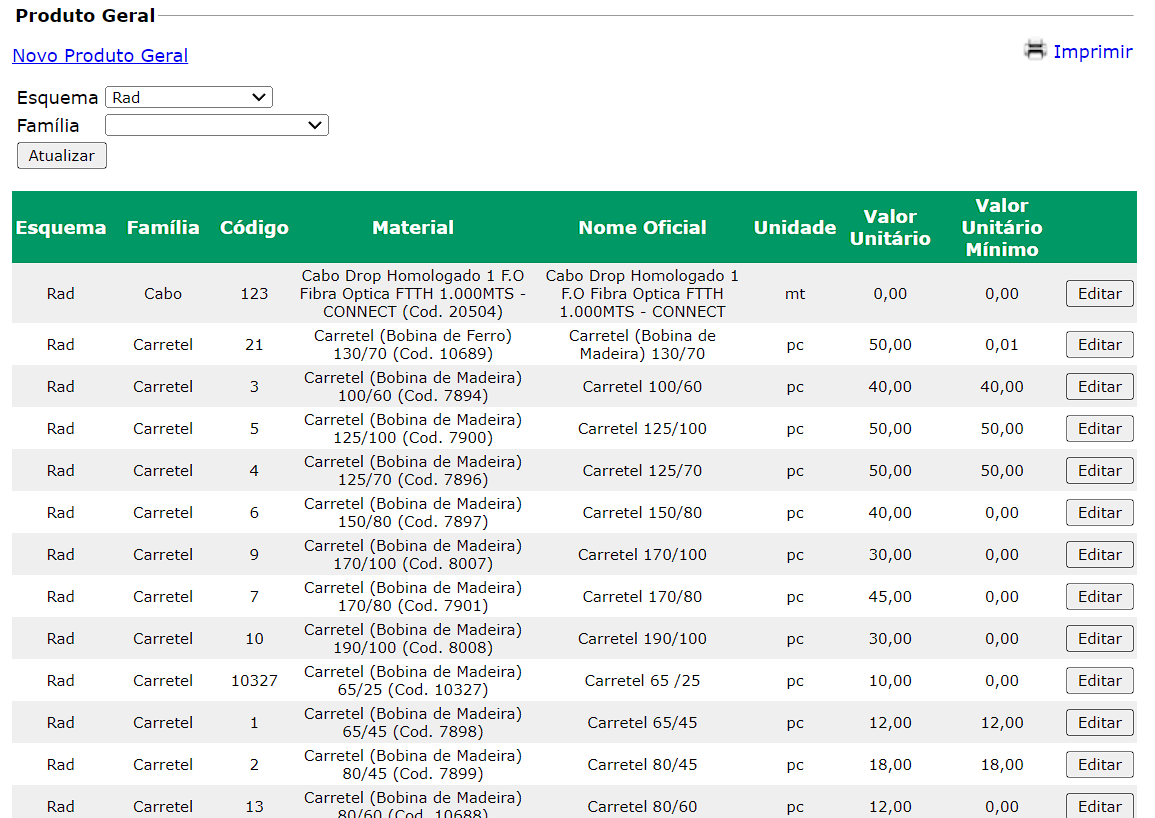 Tabela de Materiais: Lista de preços de materiais para orçamentação e medição de obras, contendo código, descrição e valor unitário definidos.