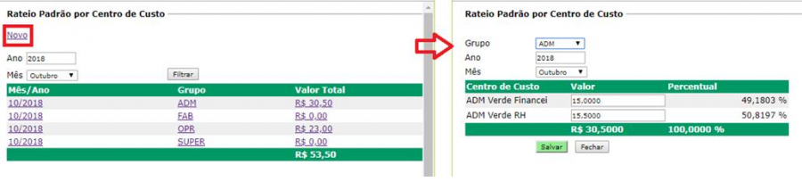 Um exemplo de cadastro pode ser visualizado abaixo, com os centros de custo pertencentes ao grupo “ADM”.