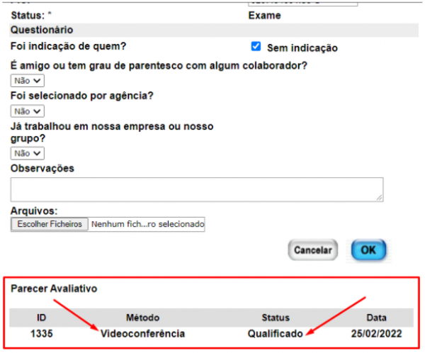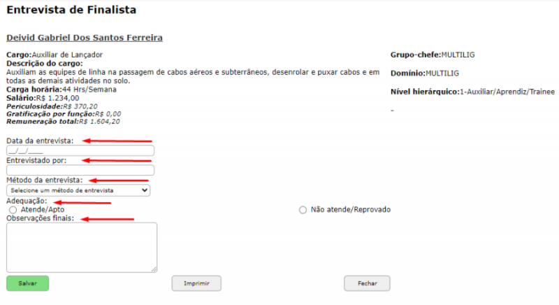 f. Agora basta preencher os campos indicados com a seta, fazer uma descrição detalhada para históricos futuros e uma possível reciclagem do candidato. Para finalizar basta clicar em Salvar.