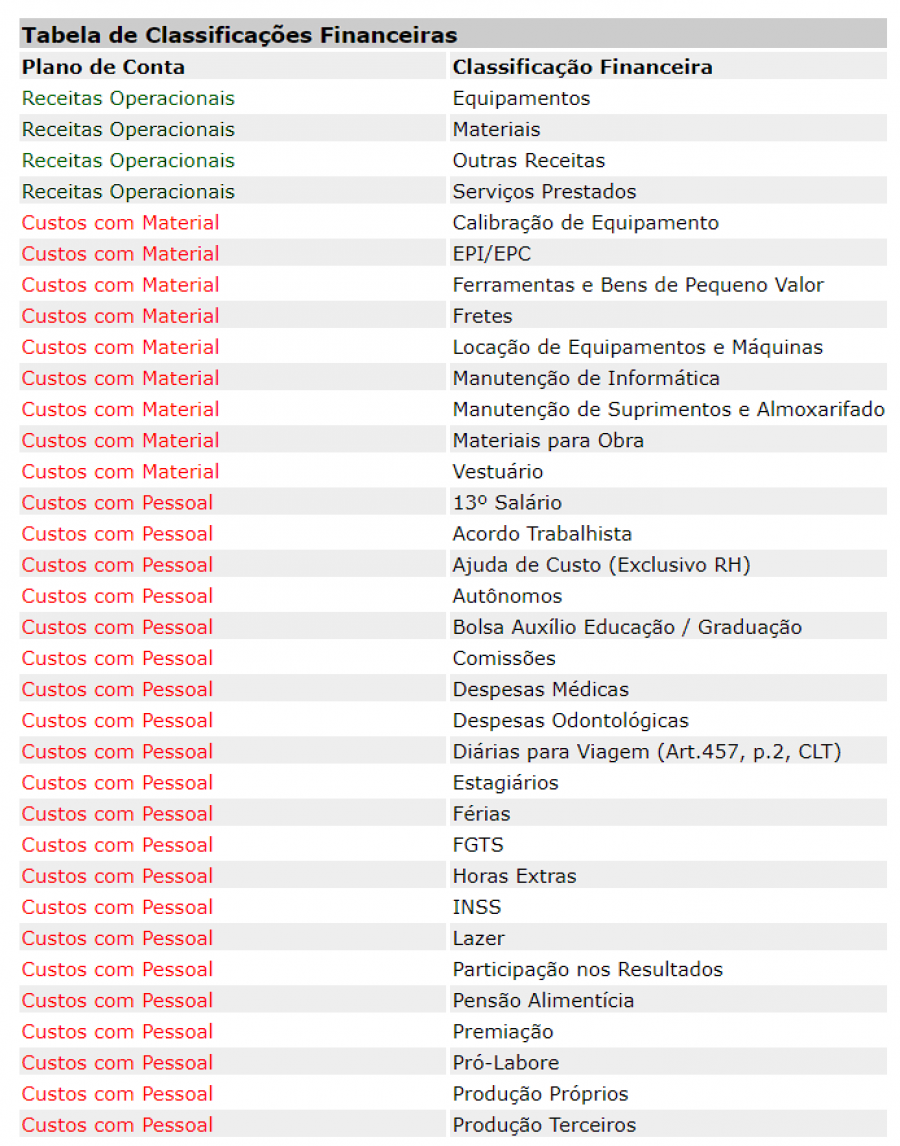 Esta tela exibe uma lista das classificações financeiras do sistema e seus respectivos planos de conta em formato tabular.