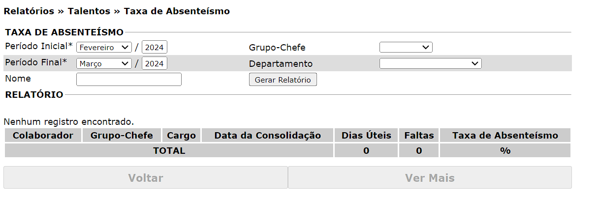 Este relatório permite identificar a frequência de ausências dos colaboradores, destacando aqueles que apresentam um número elevado de faltas. A análise da taxa de absenteísmo é essencial para monitorar o comprometimento, detectar possíveis problemas de saúde, clima organizacional ou insatisfação, e apoiar a elaboração de estratégias preventivas.